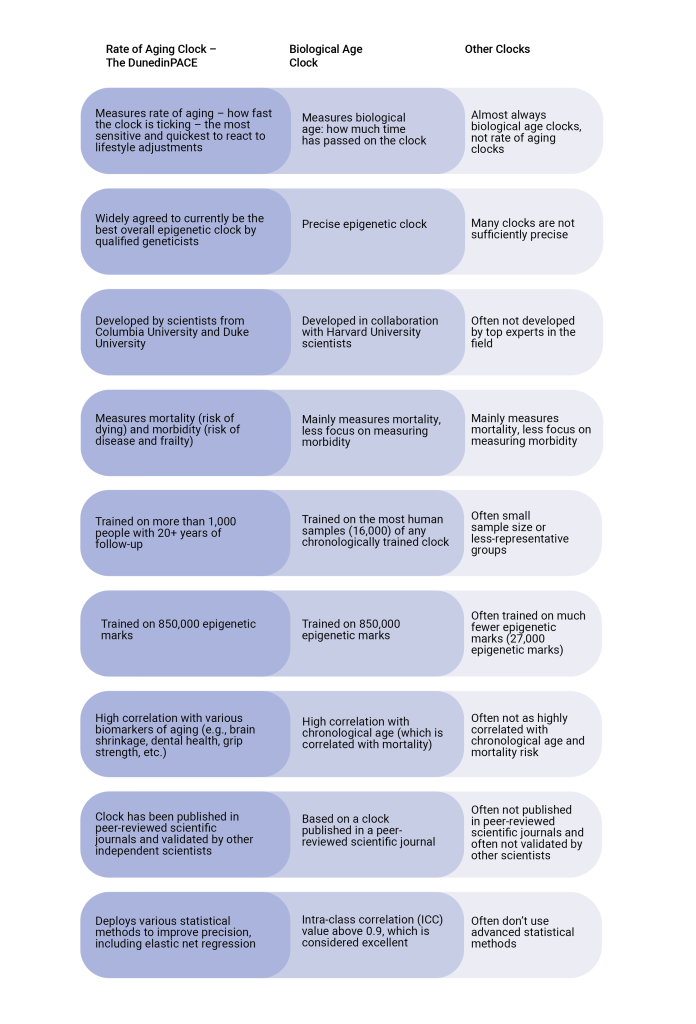 The latest, third generation of epigenetic clocks includes the DunedinPACE clock, widely considered by industry experts to be the most accurate and actionable of all epigenetic clocks to date.