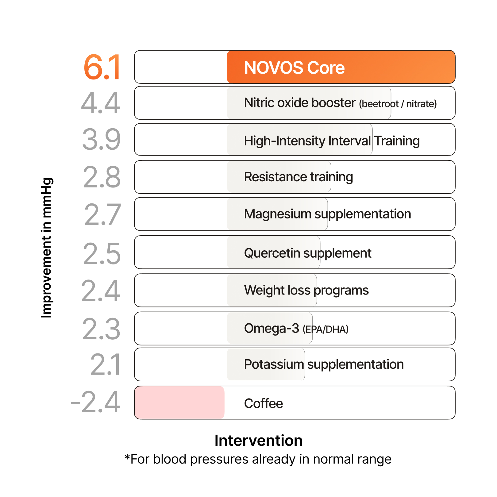 Supported ~8.5–8.7 mmHg differences in systolic blood pressure vs. placebo in adults already in the normal range, exceeding effect sizes reported for common supplements including beetroot/nitrate and potassium, and demonstrating magnitudes of support comparable to those observed for Mediterranean and DASH-style diets and High Intensity Interval Training (HIIT).*