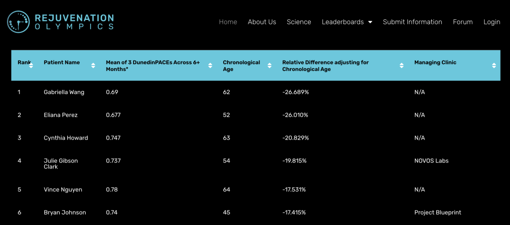 Other NOVOS customers who elected to submit their results to Bryan Johnson’s own Rejuvenation Olympics have achieved fantastic results as shared on his leaderboard. For example, NOVOS customer Julie Gibson Clark outranked Bryan by achieving a minus 19.8% biological age to chronological age and a slower pace of aging compared to Bryan’s result of minus 17.4%. When asked, Julie said she achieved these results by simply taking NOVOS Core, and generally following NOVOS’ lifestyle guidance.